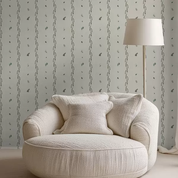 Tapet Sparsomme grønne skudd i vertikal rytme, kremfarget bakgrunn Nr. a00818