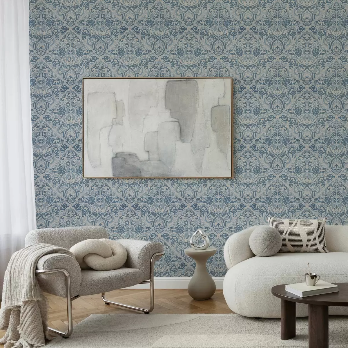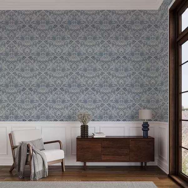 Tapet Klassisk damask, blå motiver på kremfarget bakgrunn Nr. a00826v1