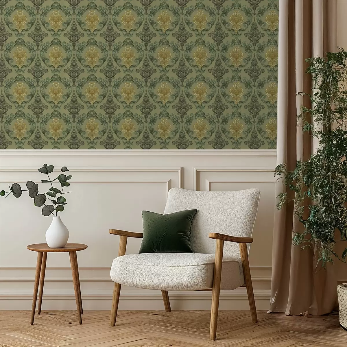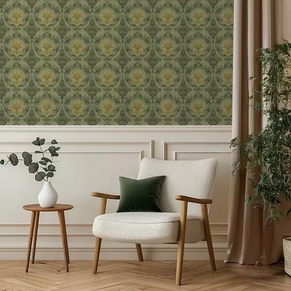 Tapet Damask med vegetabilske krøller, oliven-okker palett Nr. a00828