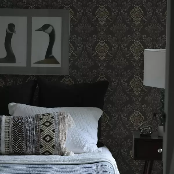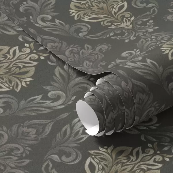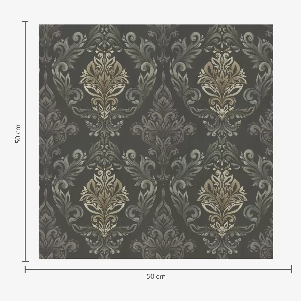 Tapet Damask på mørk grafittbakgrunn, oliven-okkerfargede detaljer Nr. a00828v5