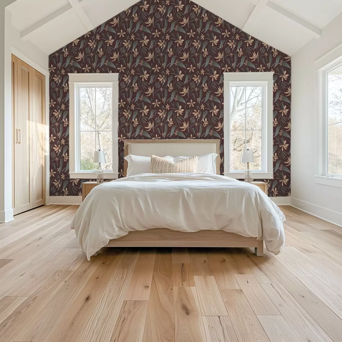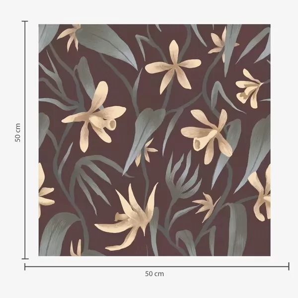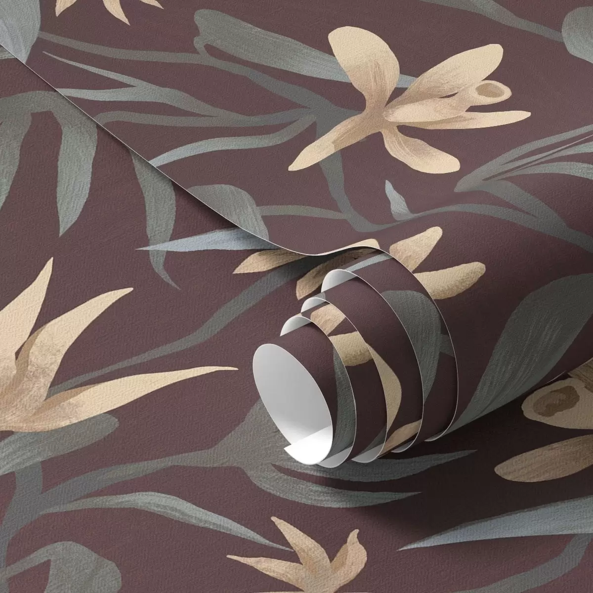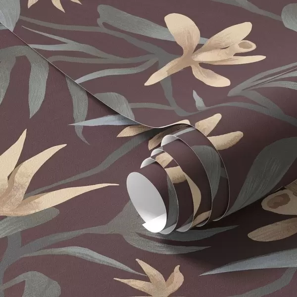 Tapet Kremfargede blomster med grå blader på burgunderfarget bakgrunn Nr. a00833