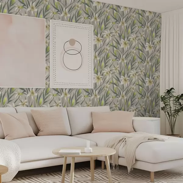 Tapet Kremfargede liljer med blader på gråbeige bakgrunn Nr. a00837