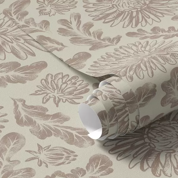 Tapet Krysantemum og eikeblader i myk beige-brun farge Nr. a00840