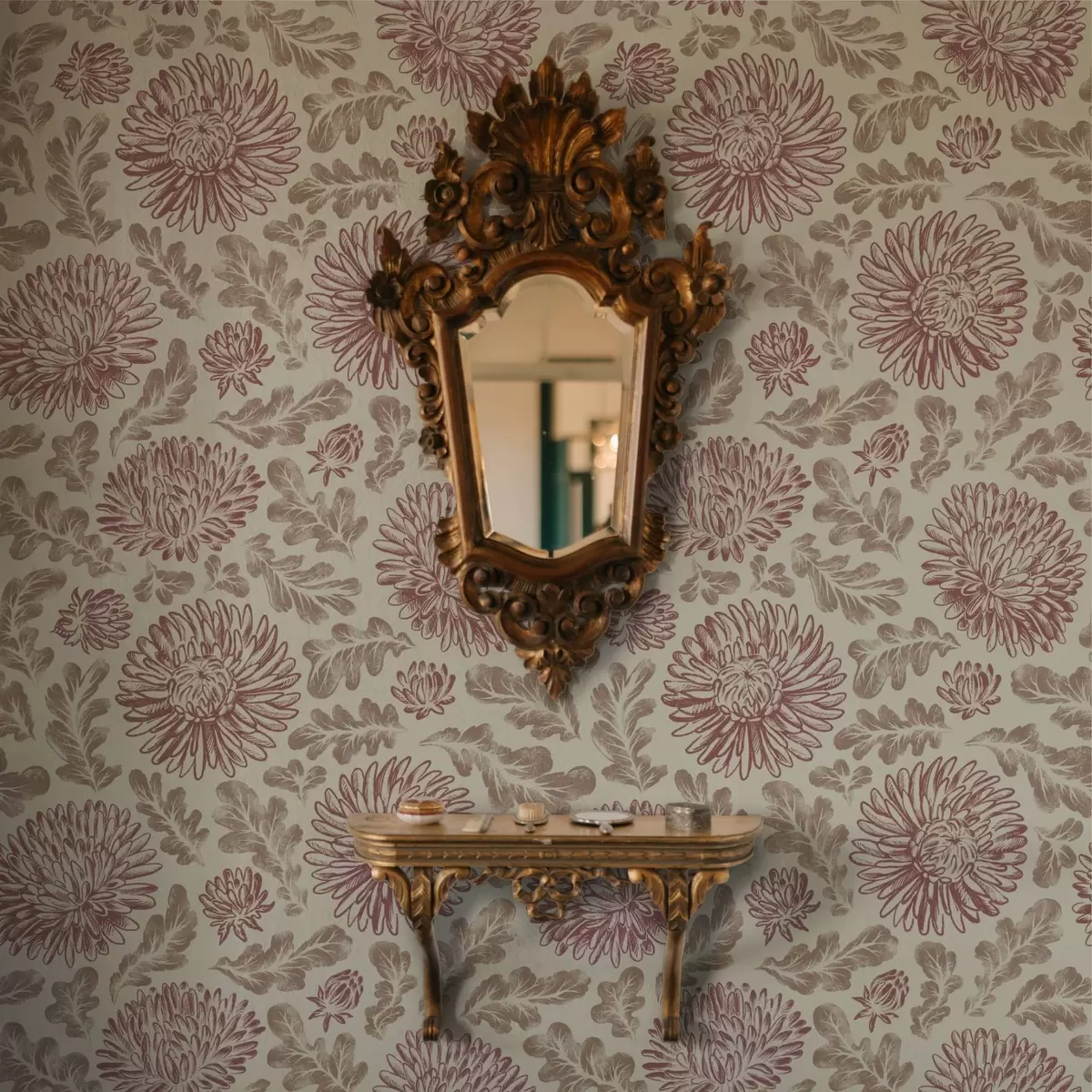 Tapet Krysantemum med vinaktige innslag på kremfarget bakgrunn Nr. a00840v1