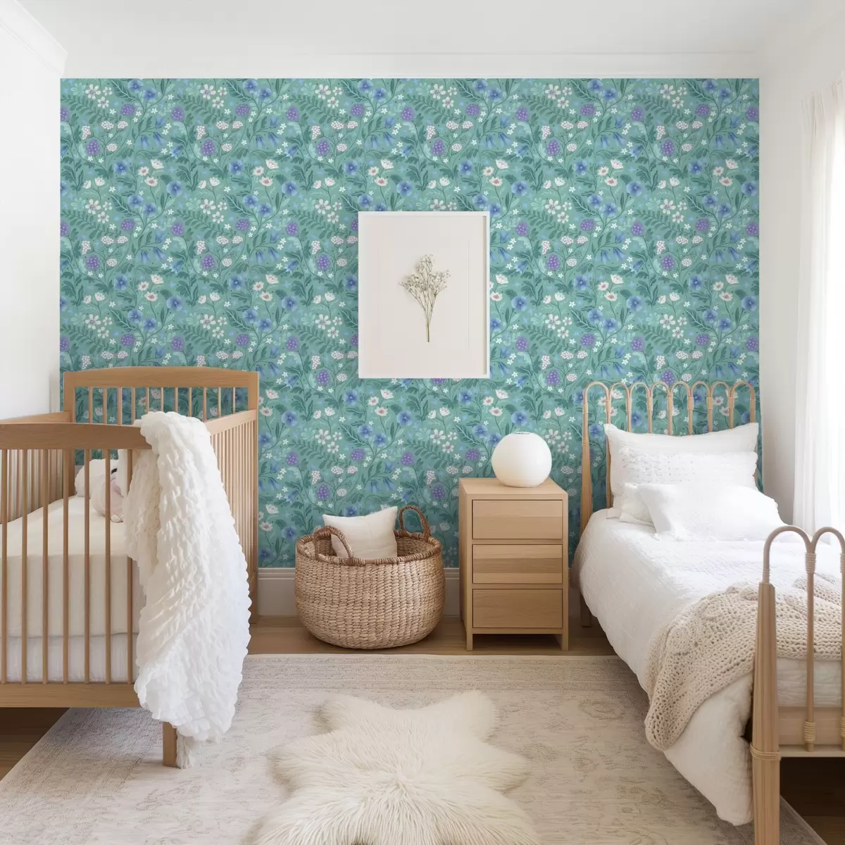 Tapet Villblomster og bær på myk myntebakgrunn Nr. a00849