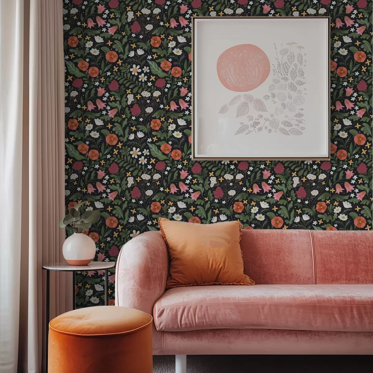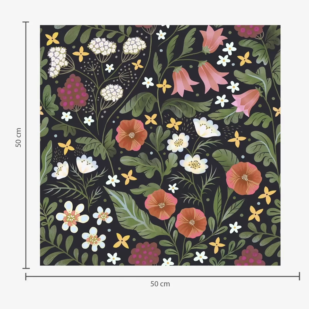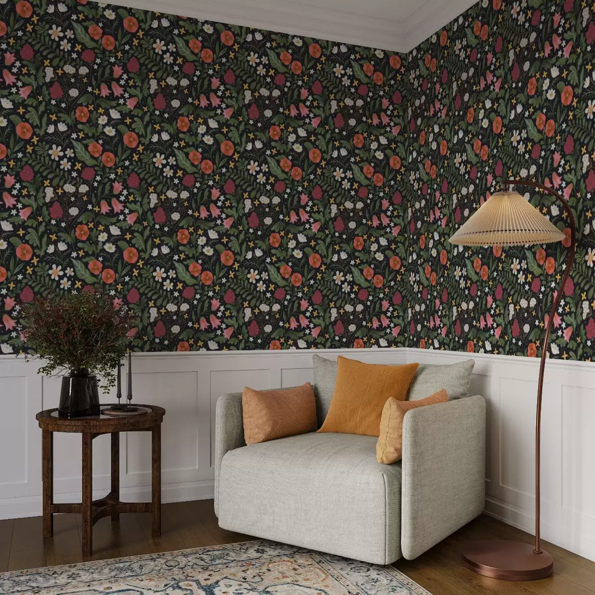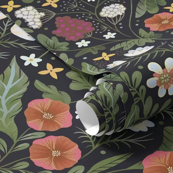 Tapet Villblomster og bær på dyp svart bakgrunn Nr. a00849v3