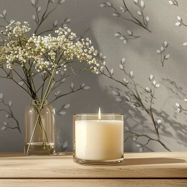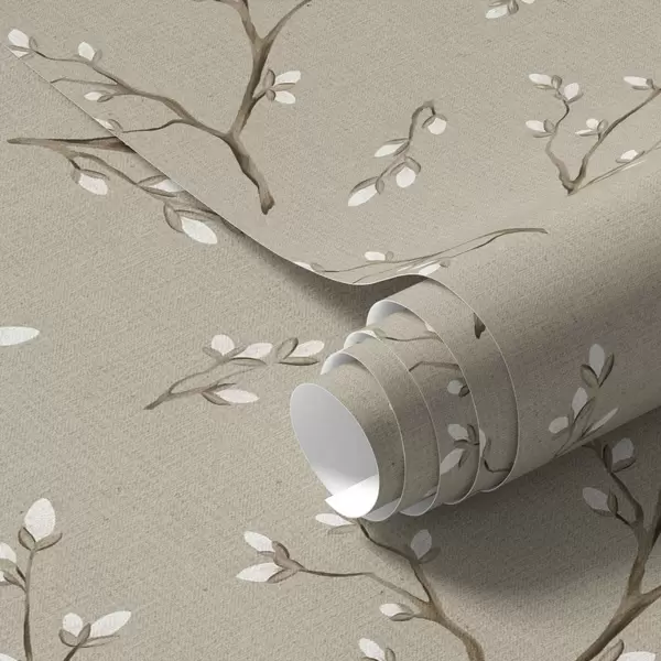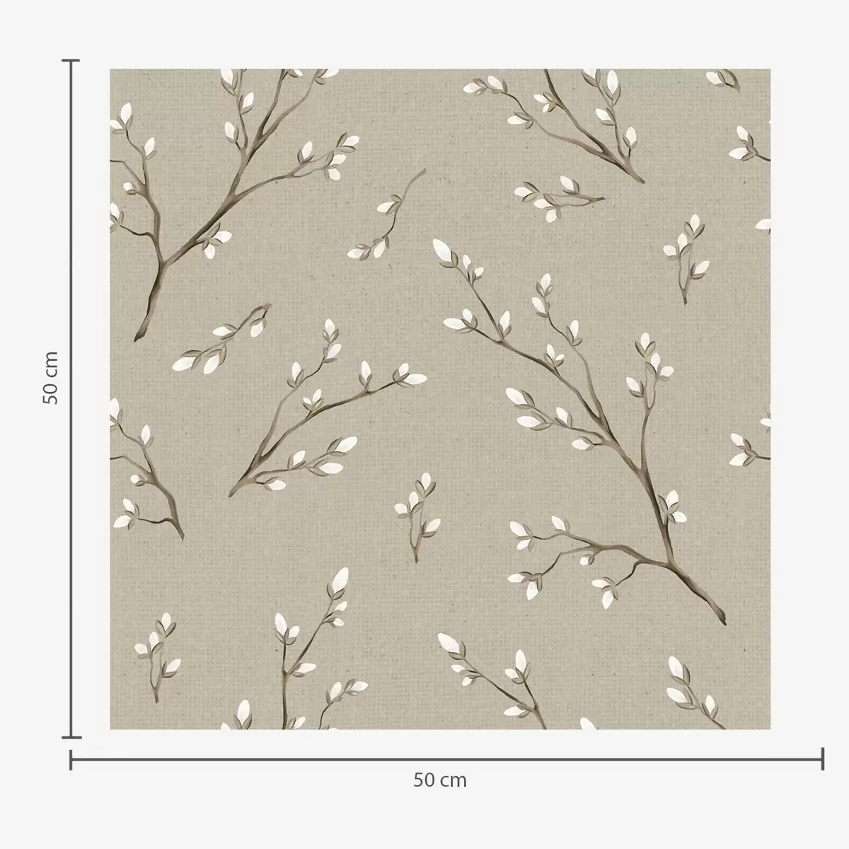 Tapet Kvister med hvite knopper på linnetaupe bakgrunn Nr. a00861
