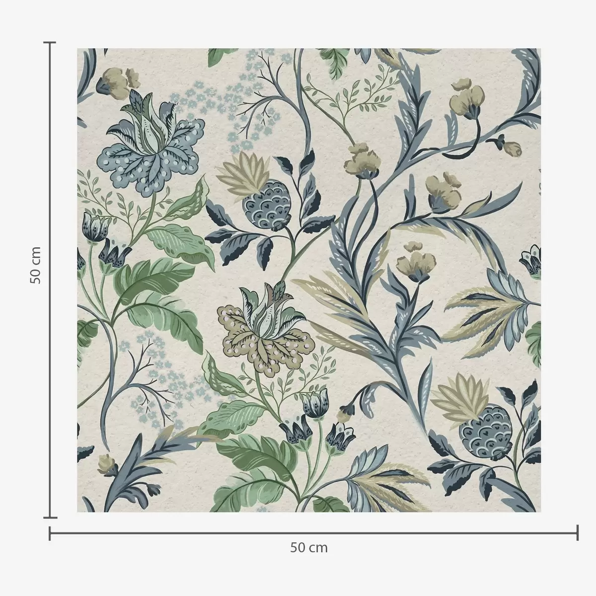 Tapet Blågrønne folkemotiver med blomster og blader på kremfarget bakgrunn Nr. a00863