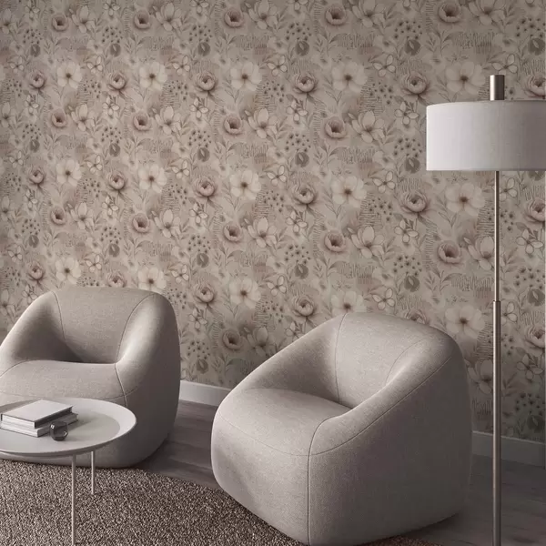 Tapet Sepia beige blomster med sommerfugl og lineære detaljer Nr. a00870