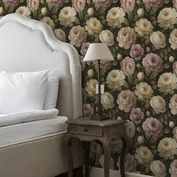 Tapet Romantiske pioner på en mørk botanisk bakgrunn Nr. a00893