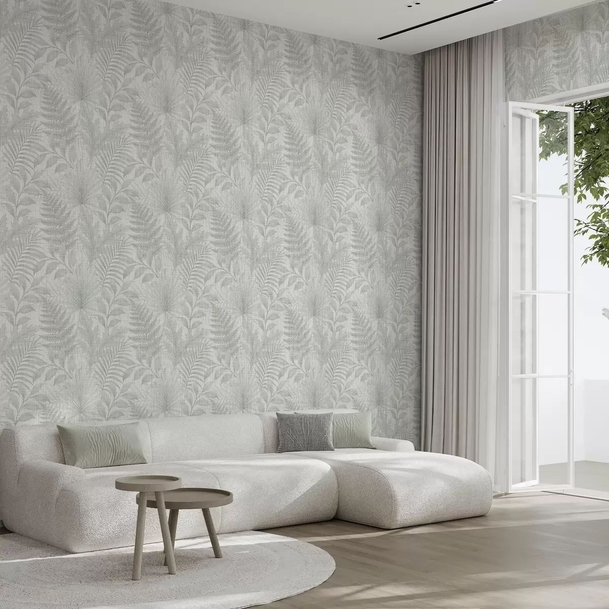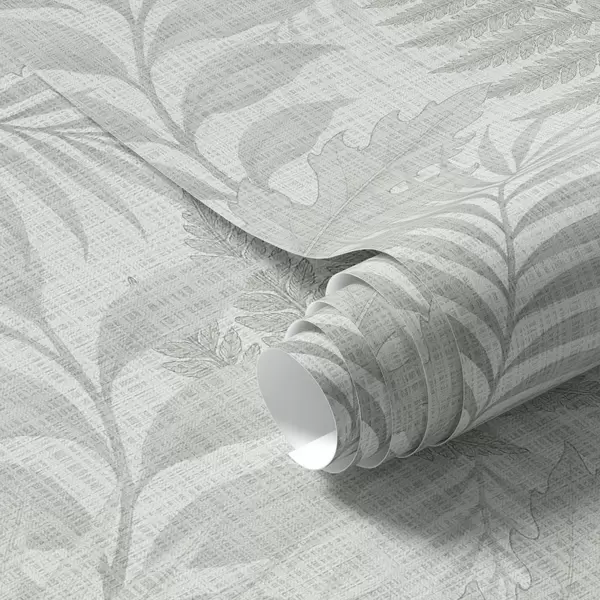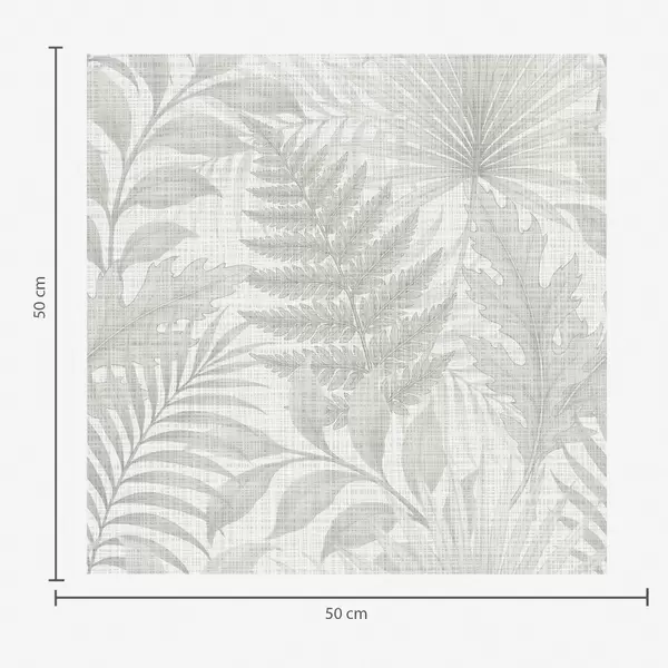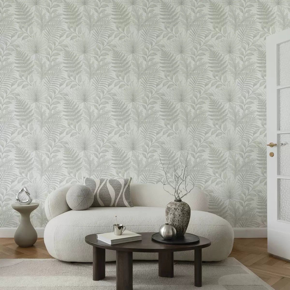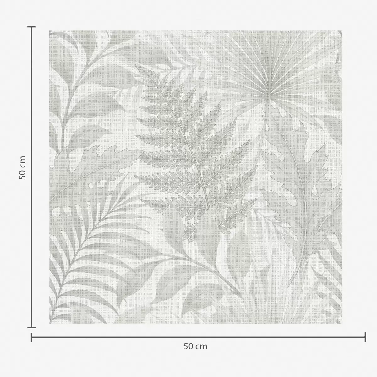 Tapet Myke tropiske blader i lysegrått på lintekstur Nr. a00899