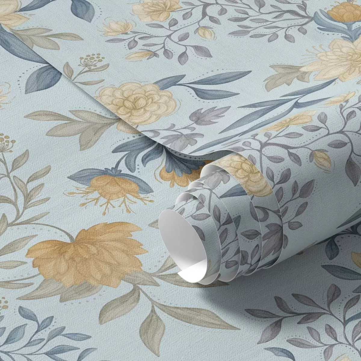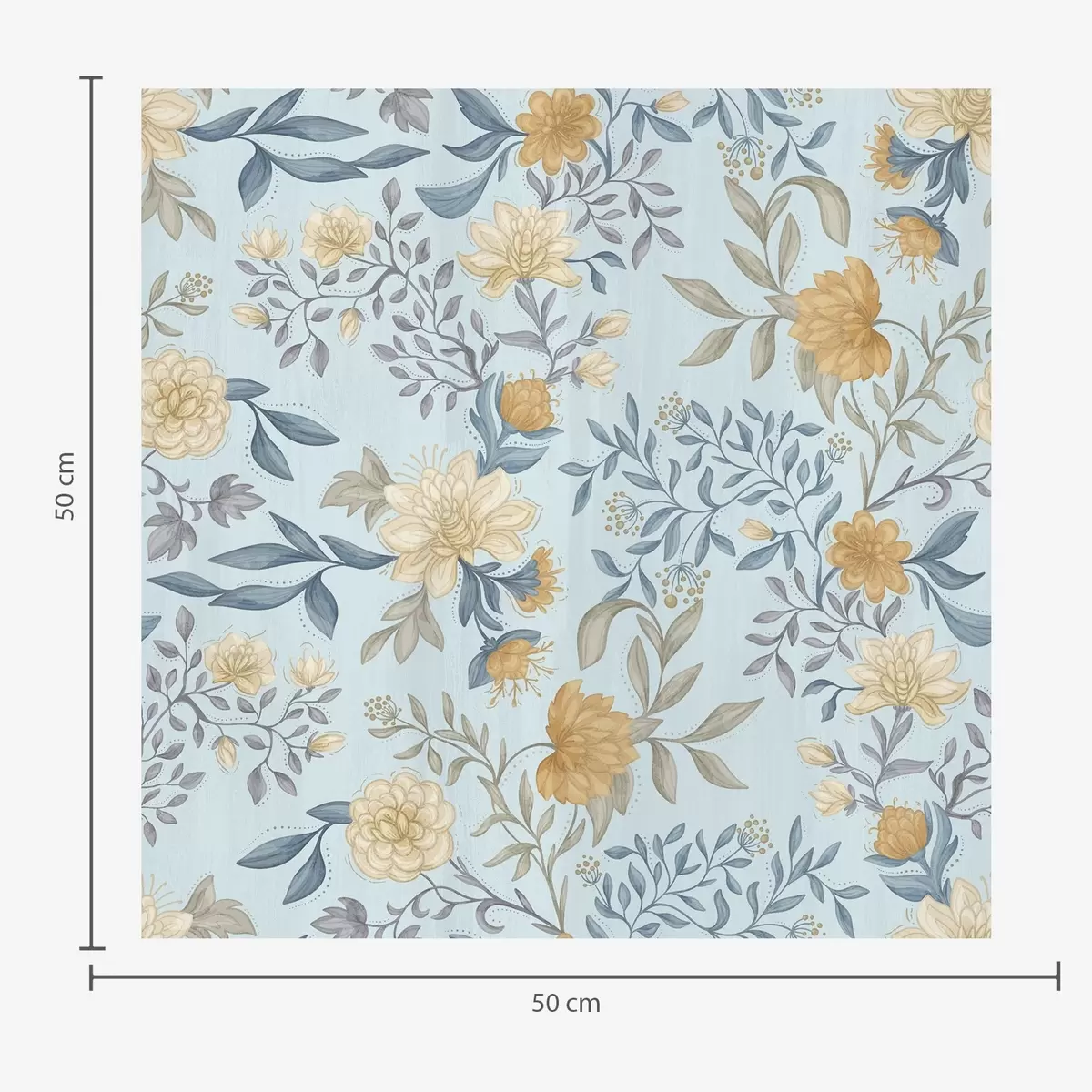 Tapet Gule og blå blomster med blader på himmelblå bakgrunn Nr. a00934