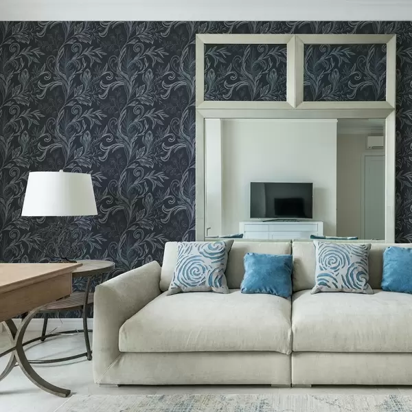 Tapet Mørke indigo krøllete blader med håndtegnet skyggelegging Nr. a00935