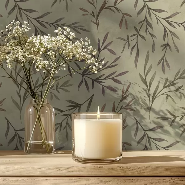 Tapet Lilla og grønne grener med blader på en varm bakgrunn Nr. a00936v4