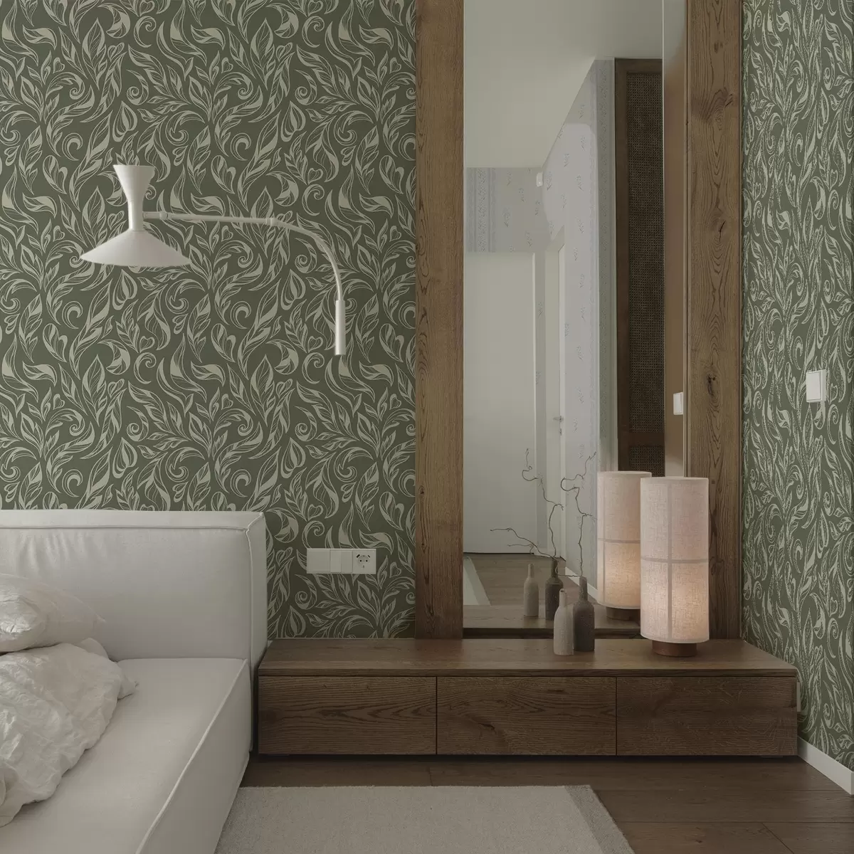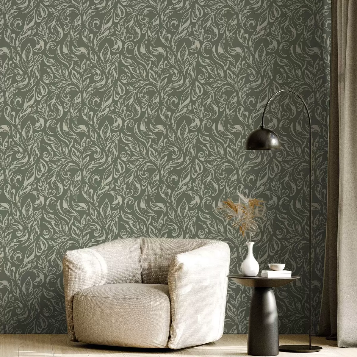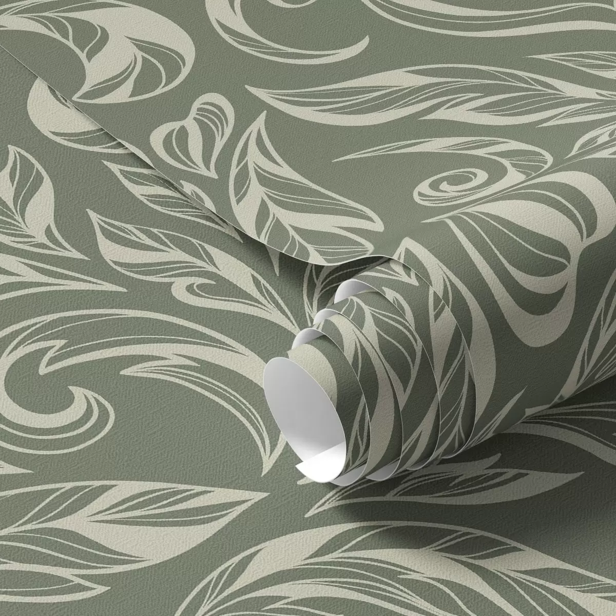 Tapet Kremfarget bladornament på grønngrå bakgrunn Nr. a00940v2