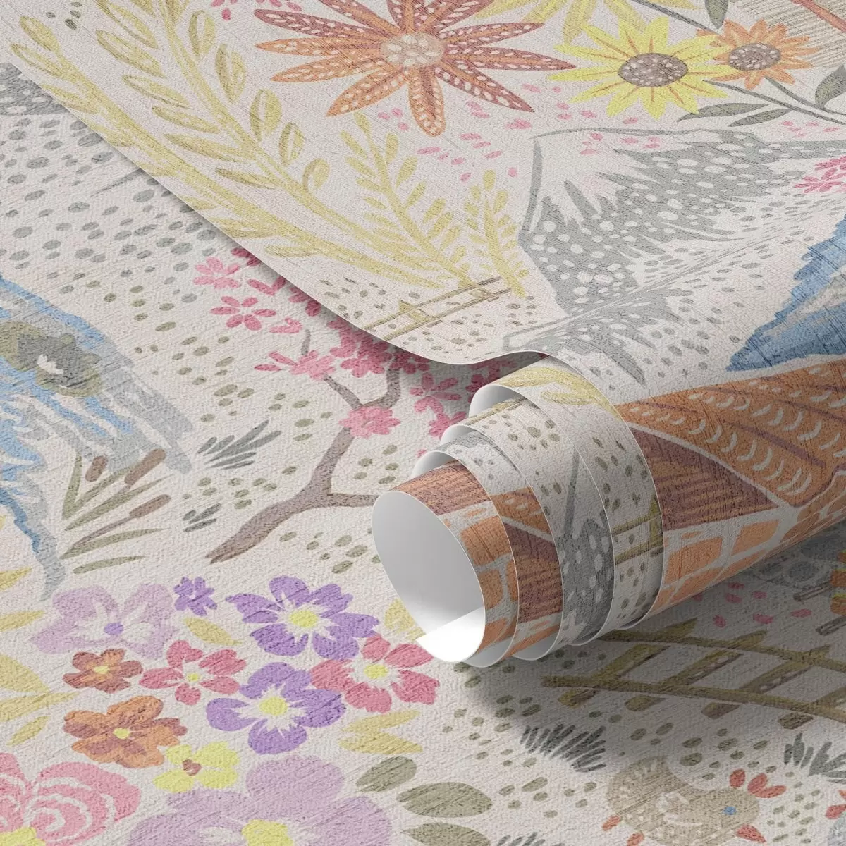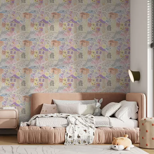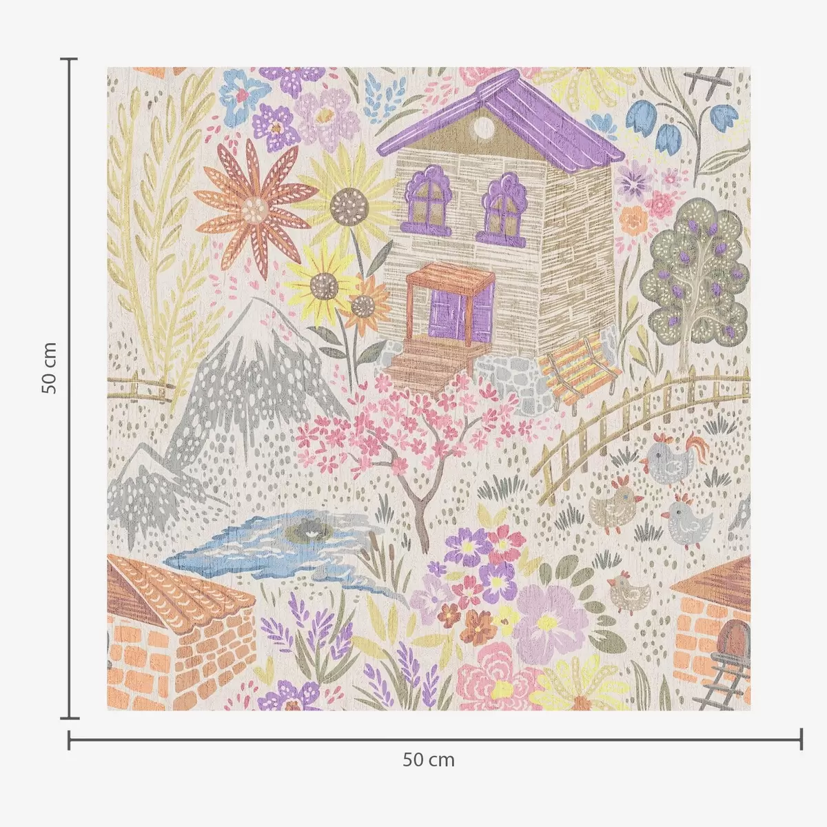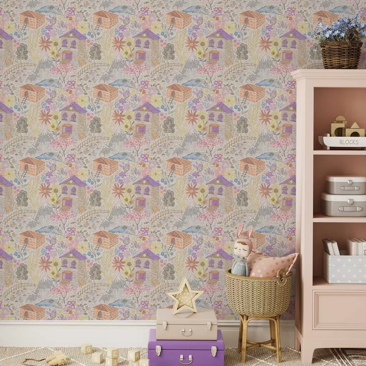 Tapet Barnslig tegning av en landsby med et hus, fjell og blomster Nr. a00952