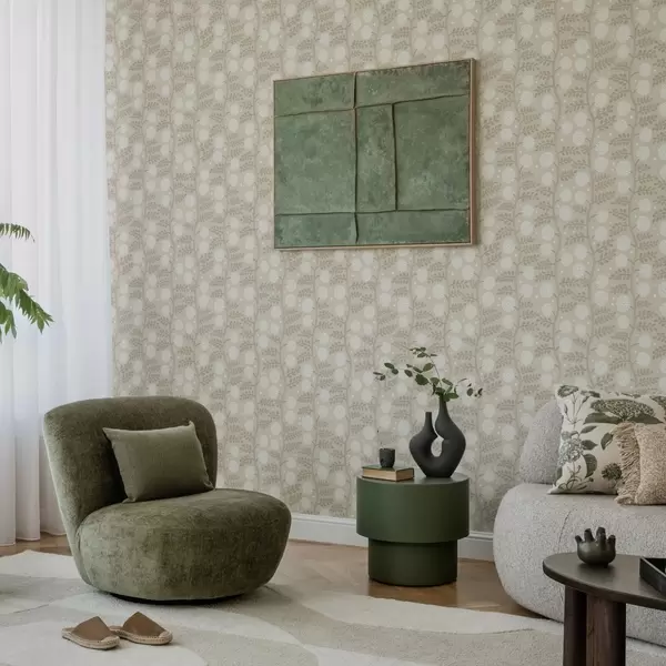 Tapet Beige stilker med hvite, fluffy blomster og myke prikker Nr. a00997