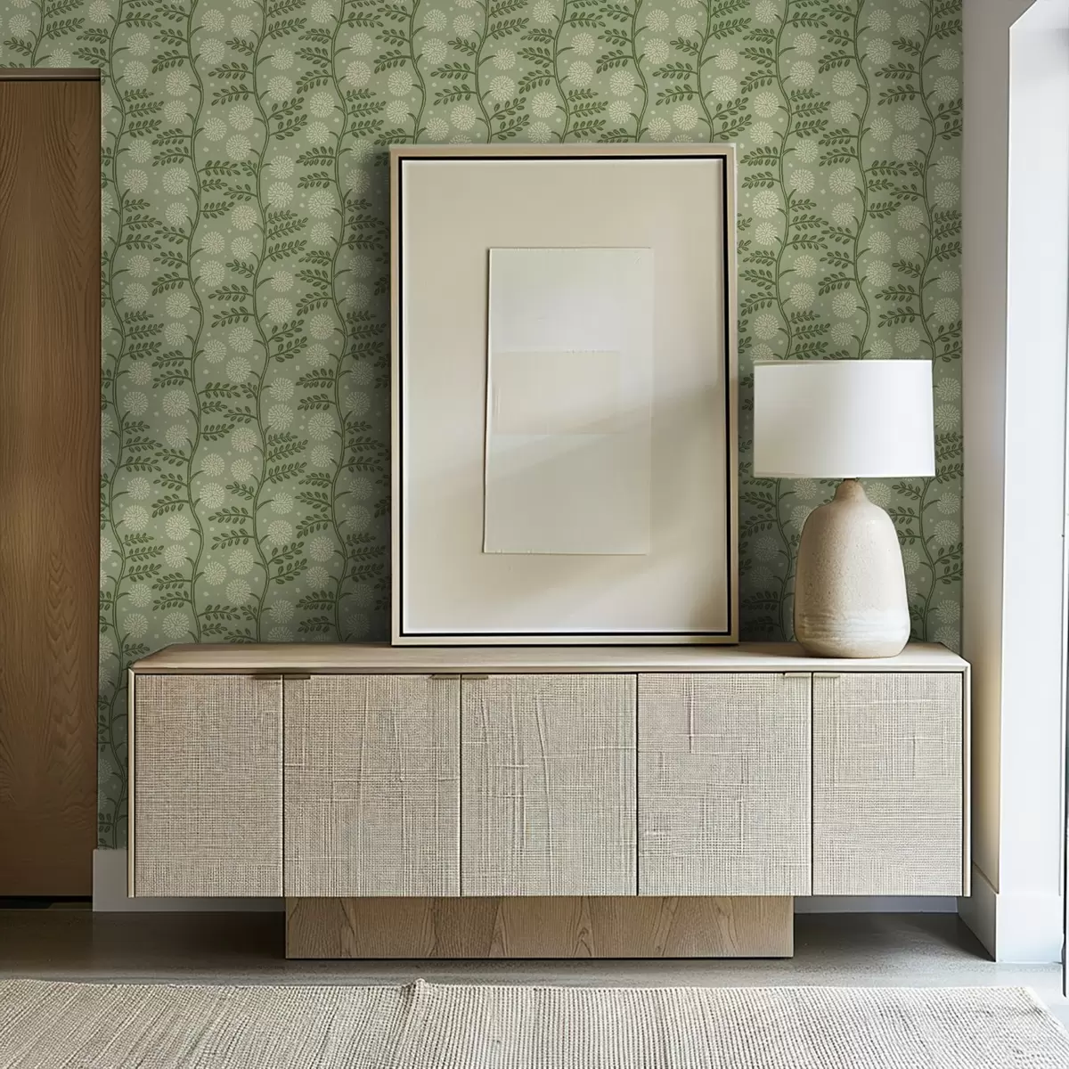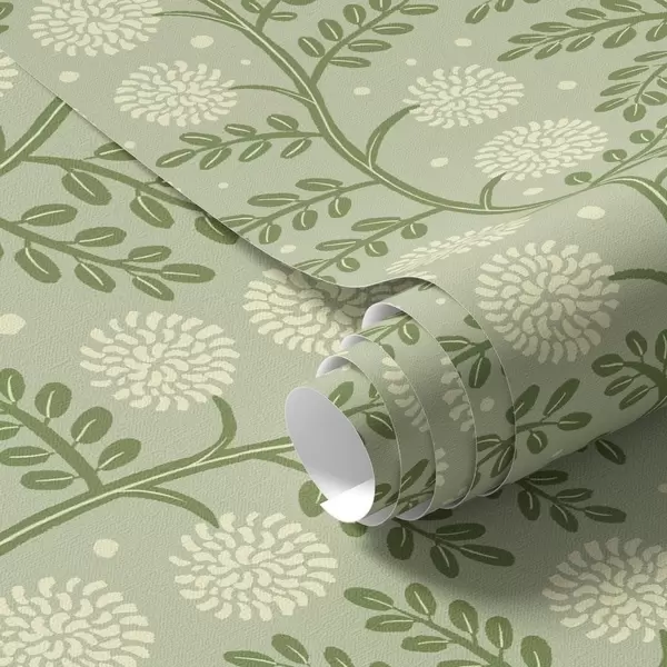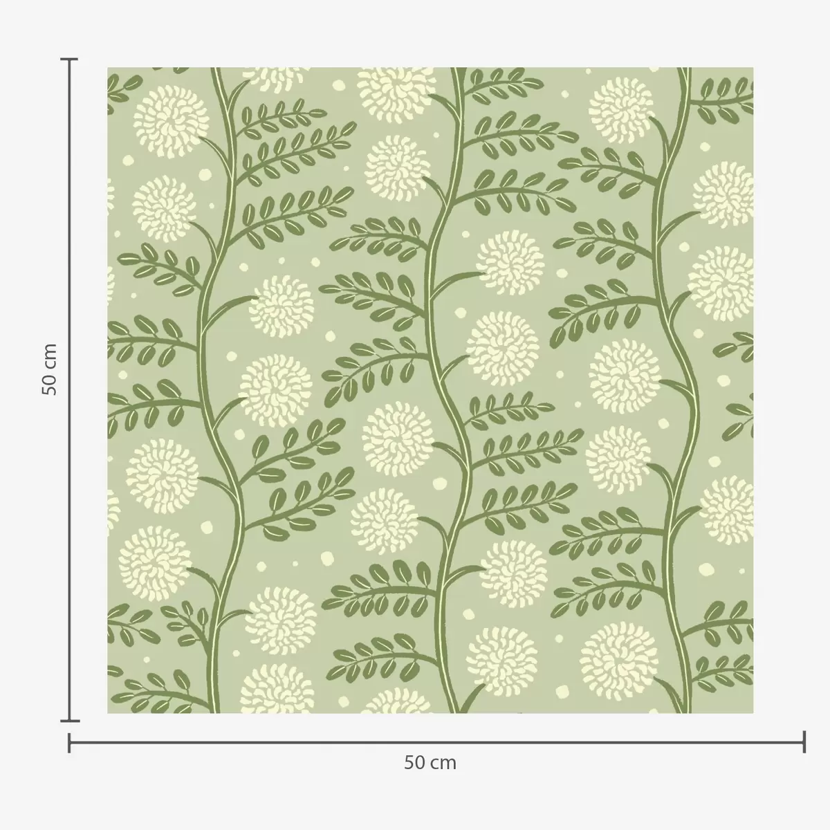 Tapet Salviegrønne stilker med elfenbensfargede, fluffy blomster og prikker Nr. a00997v2
