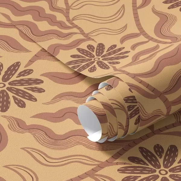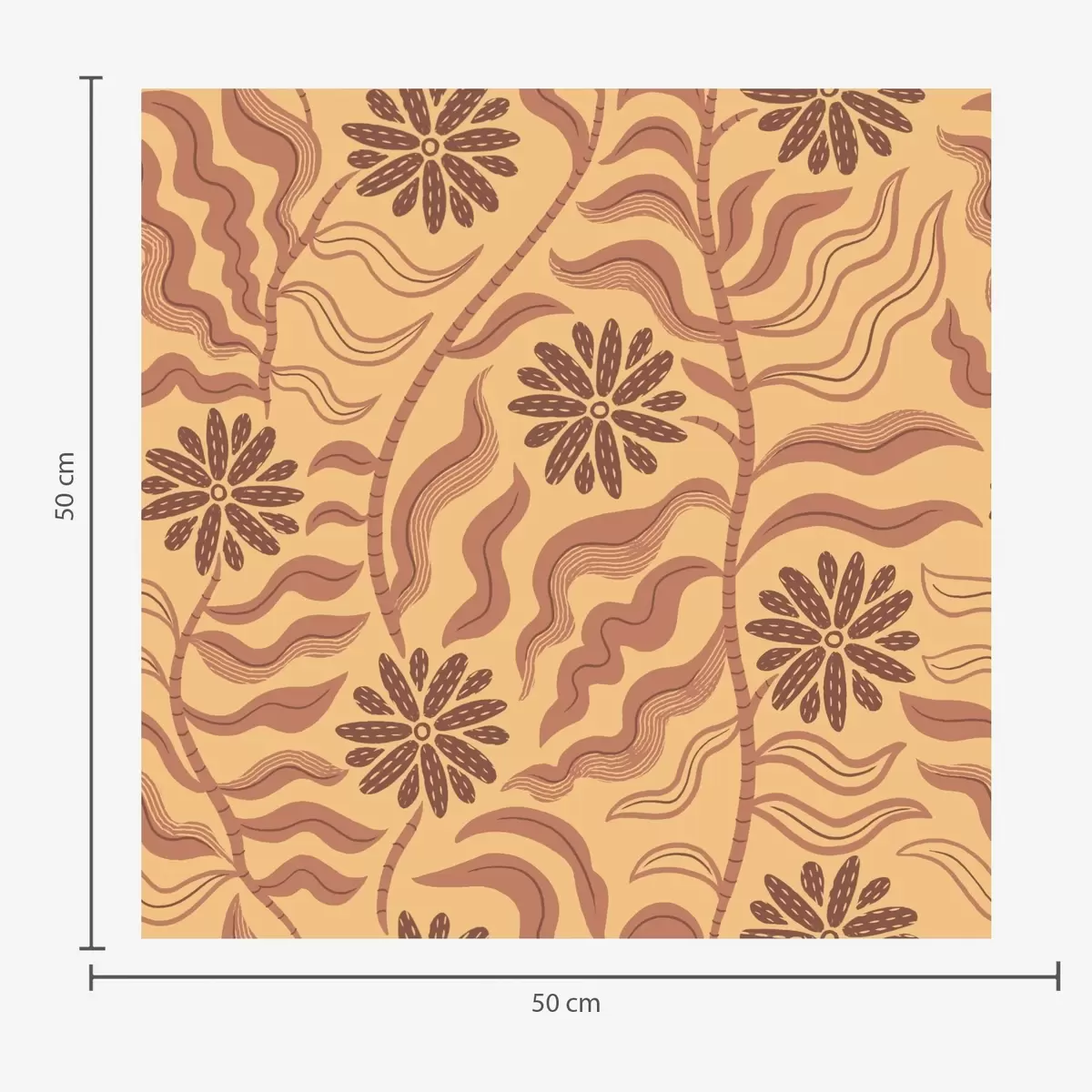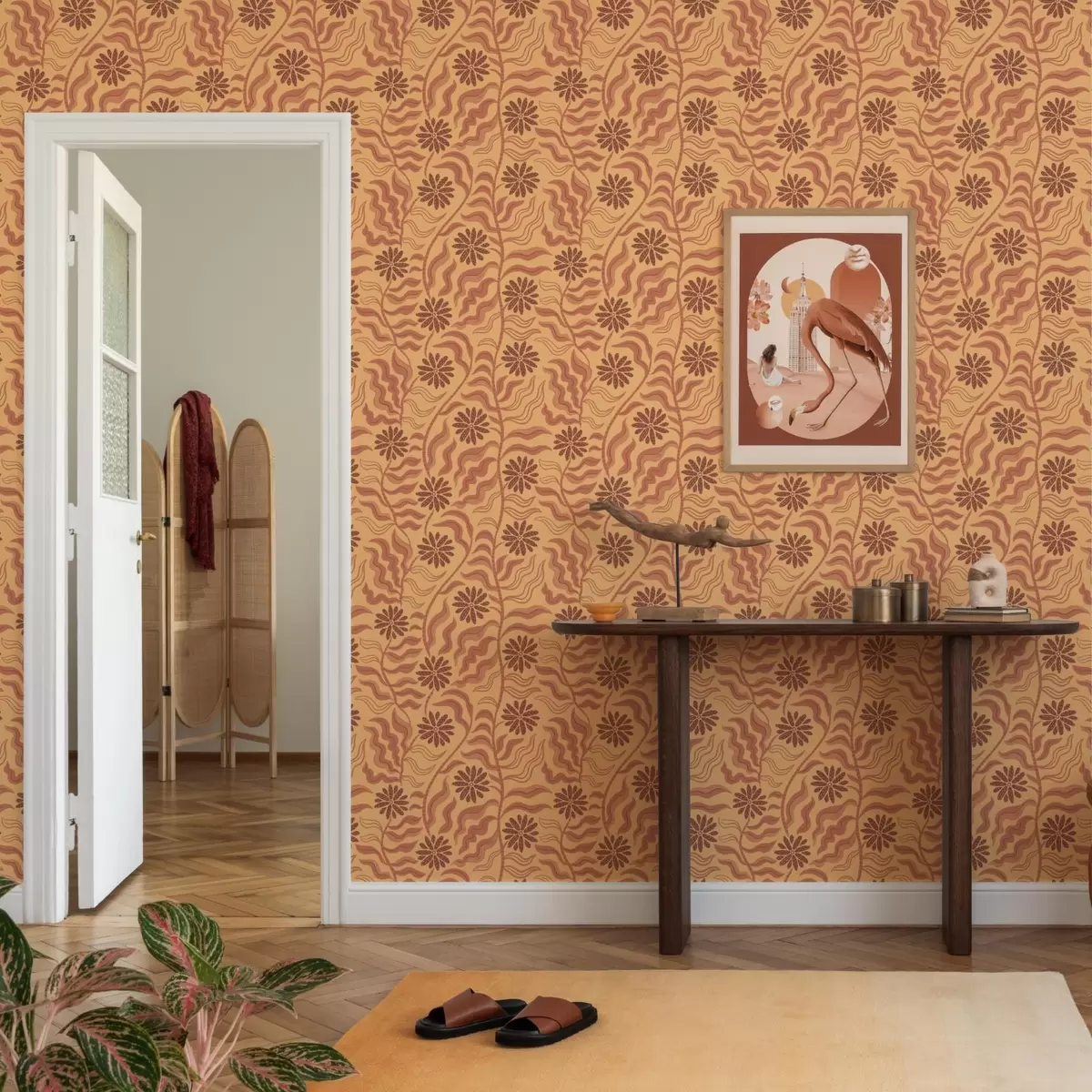 Tapet Varme, bølgete blomster og blader i senneps- og terrakottafarger Nr. a00998v2