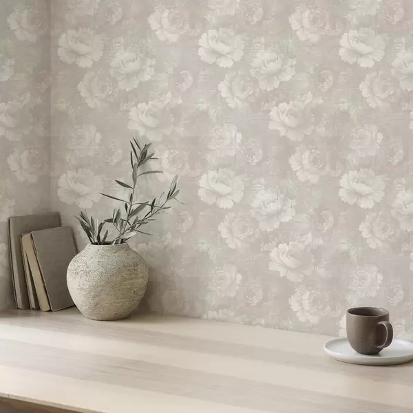 Tapet Blekede pioner på lintekstur i en myk beige palett Nr. a01018