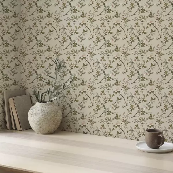 Tapet Lette grener med små kremfargede blomster og grønne blader Nr. a01028