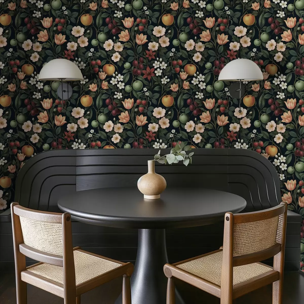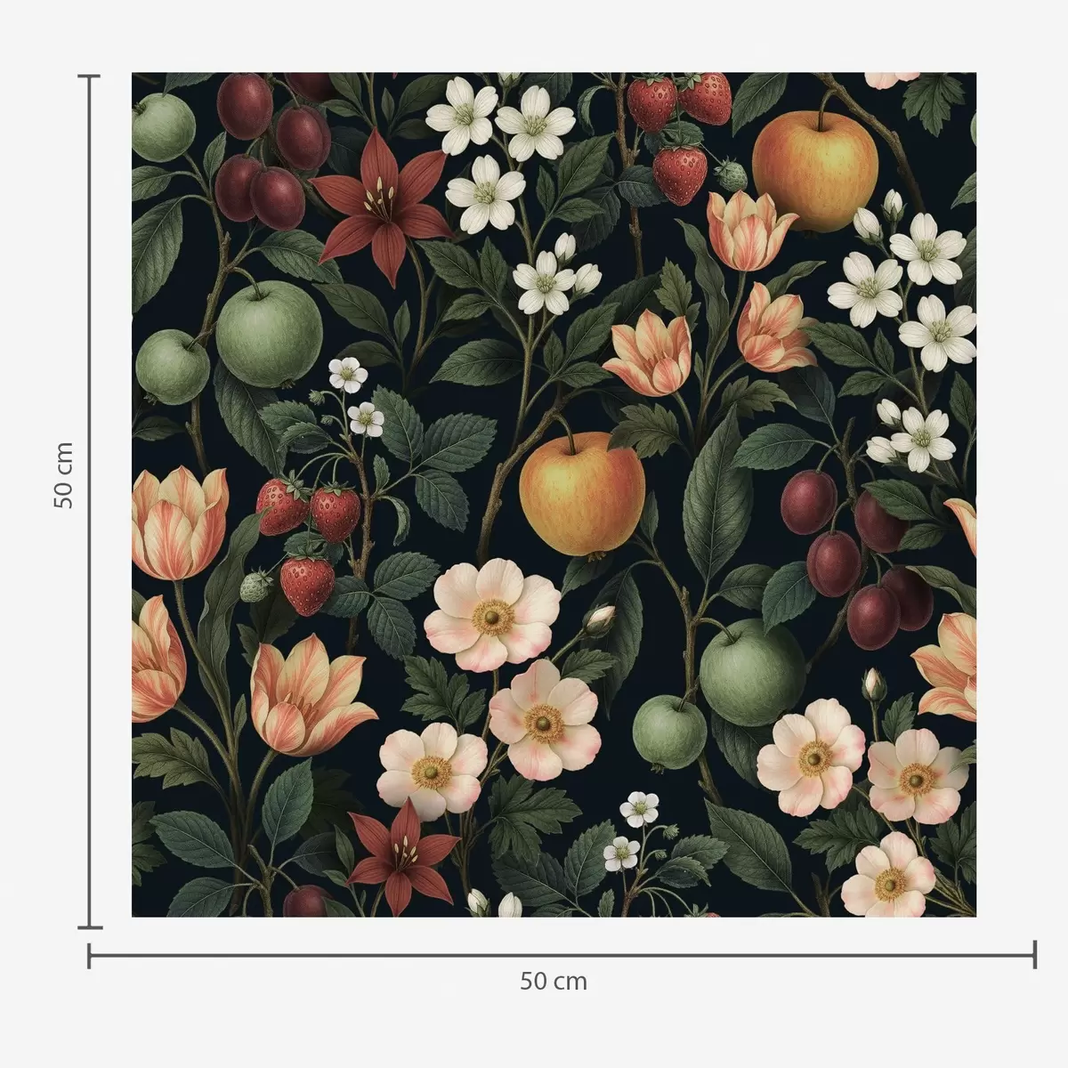 Tapet Mørk hage med blomster, modne epler og bær Nr. a01034