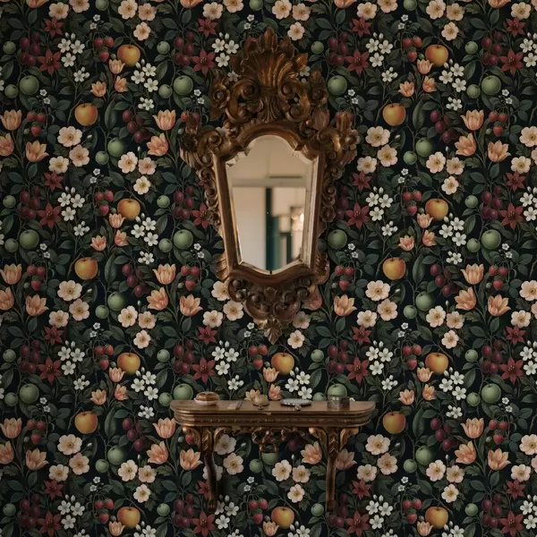 Tapet Mørk hage med blomster, modne epler og bær Nr. a01034