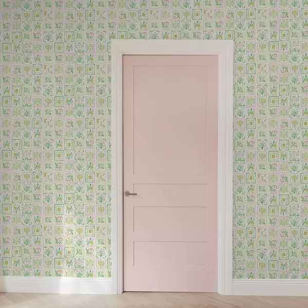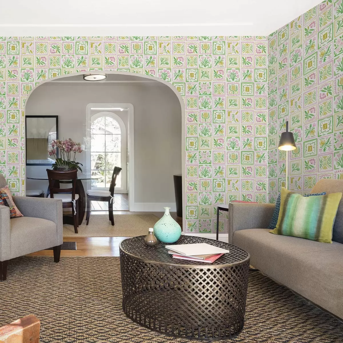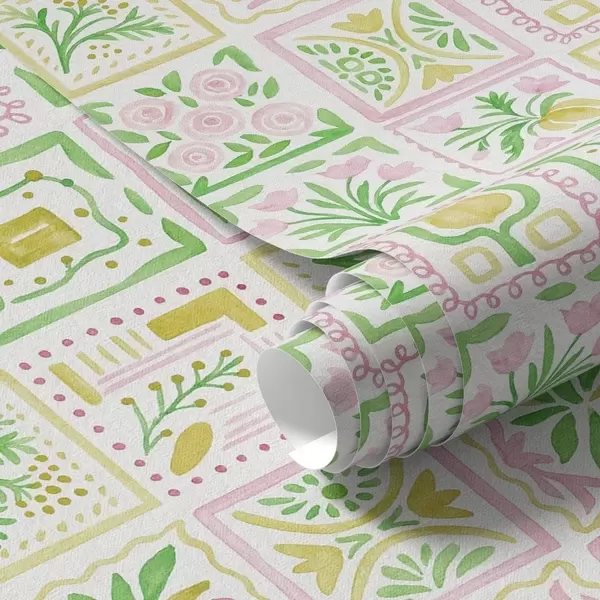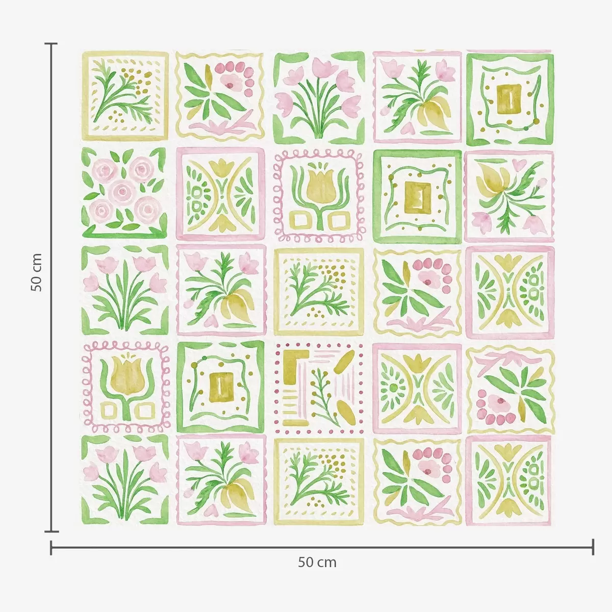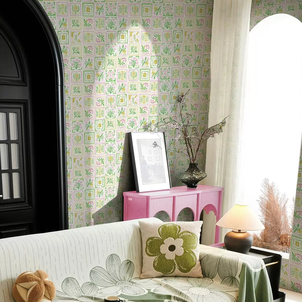 Tapet Akvarellfirkanter med rosa og grønne grener Nr. a01082