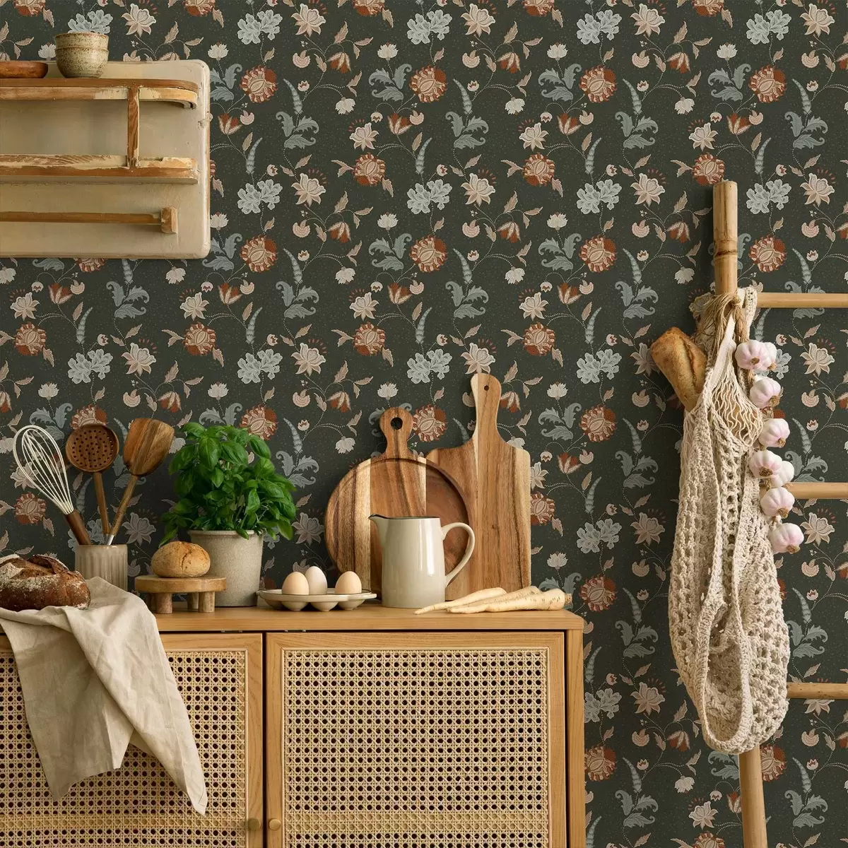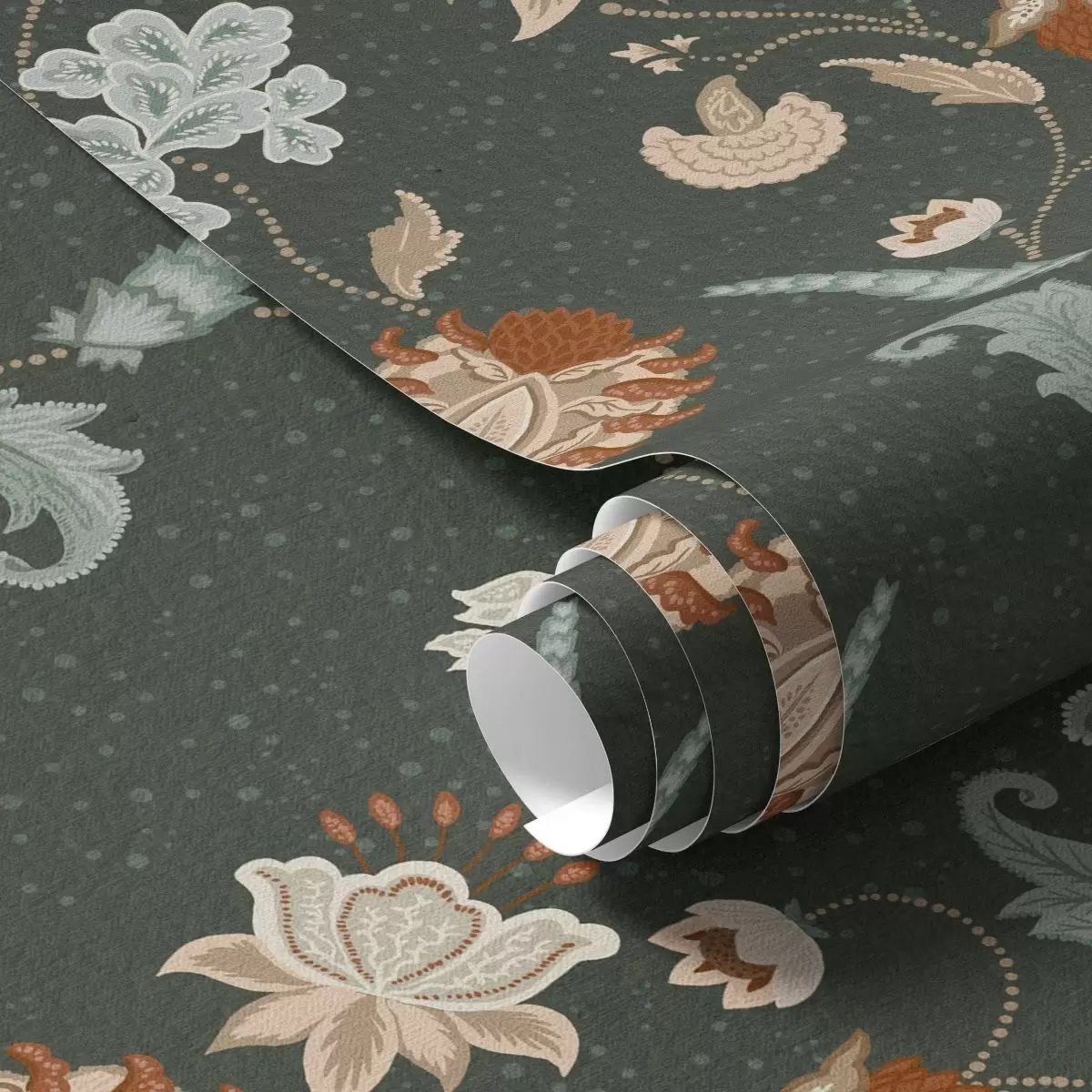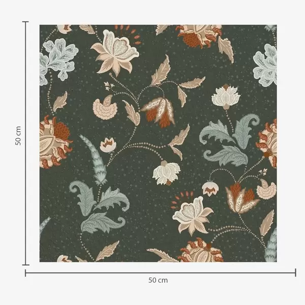 Tapet Mørkegrønn bakgrunn med dekorative blomster og blader Nr. a01086