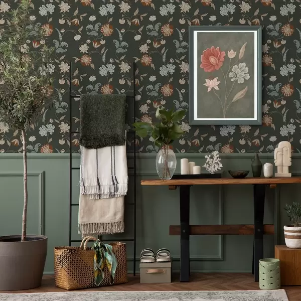 Tapet Mørkegrønn bakgrunn med dekorative blomster og blader Nr. a01086