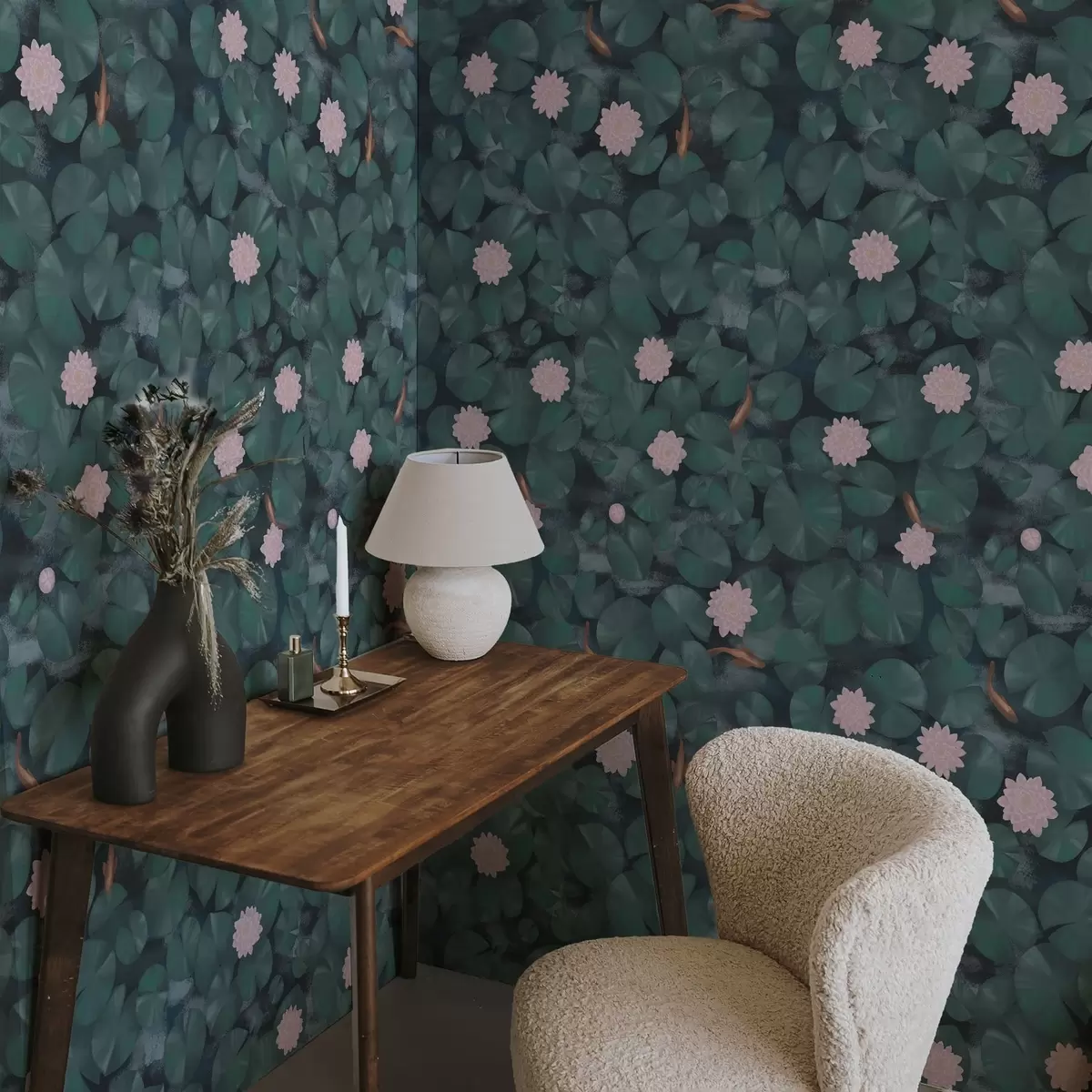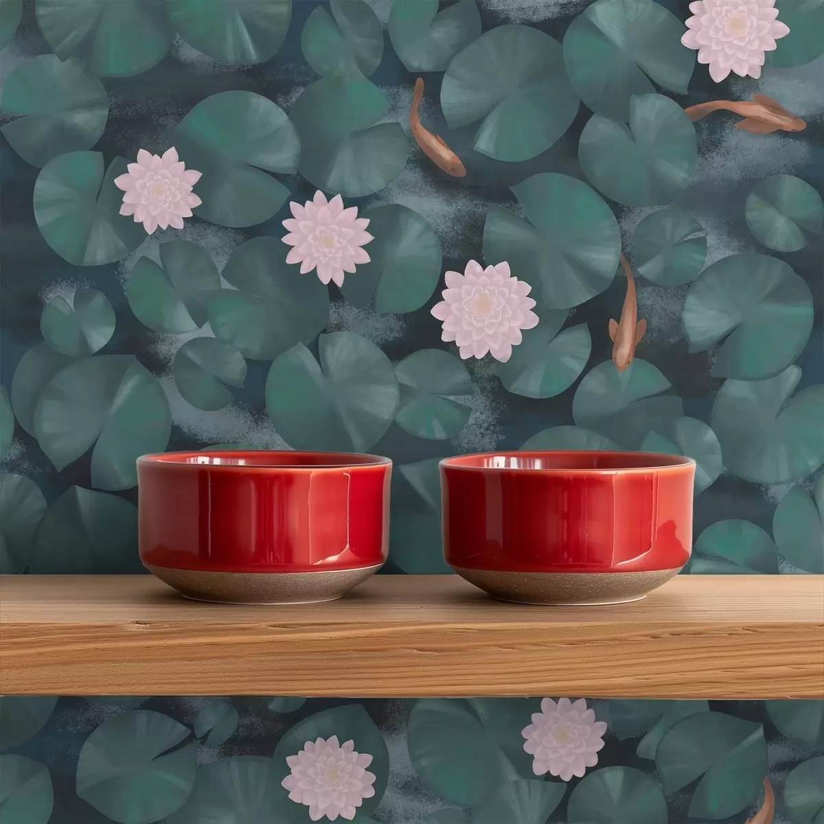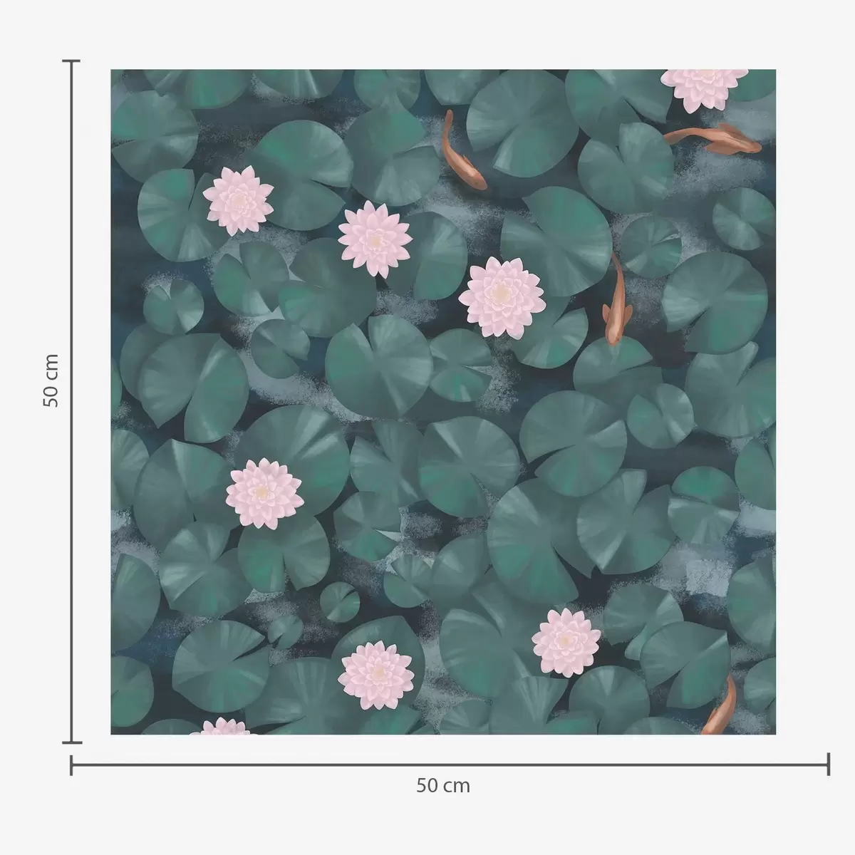 Tapet Vannliljer med blomster og fisk på mørk bakgrunn Nr. a01177
