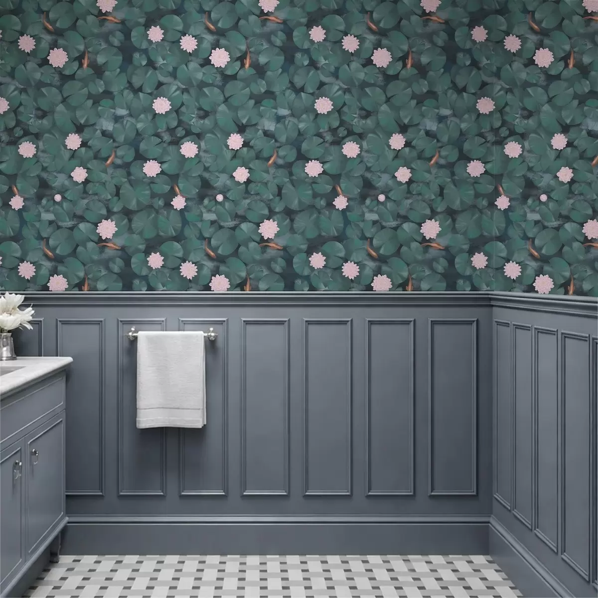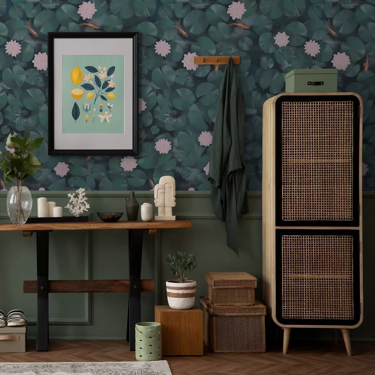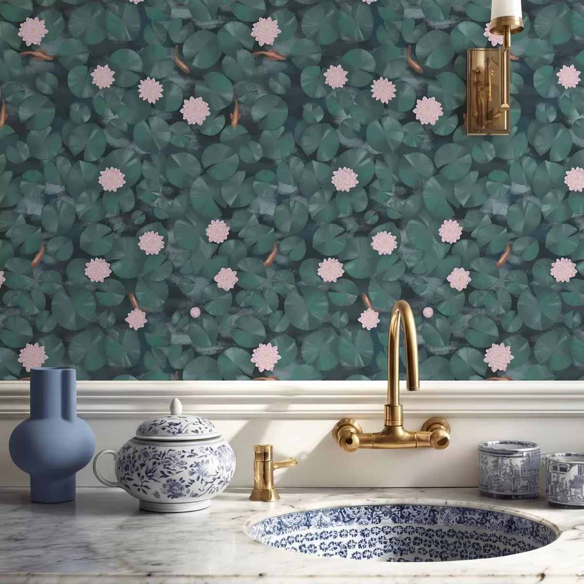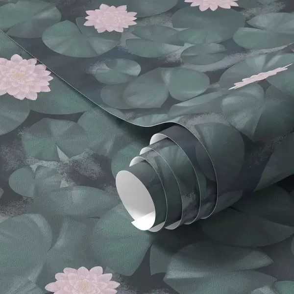 Tapet Vannliljer med blomster og fisk på mørk bakgrunn Nr. a01177